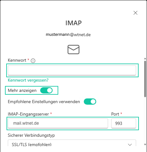 Geben Sie im Feld IMAP-Eingangsserver den Eingangsserver mail.wtnet.de ein.
