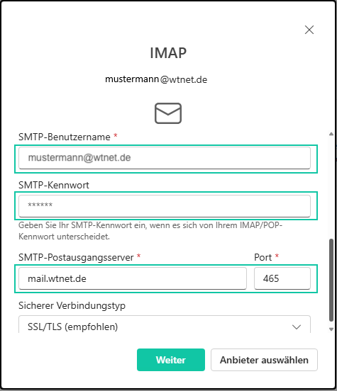 Geben Sie im Feld SMTP-Postausgangsserver den Postausgangsserver mail.wtnet.de ein.