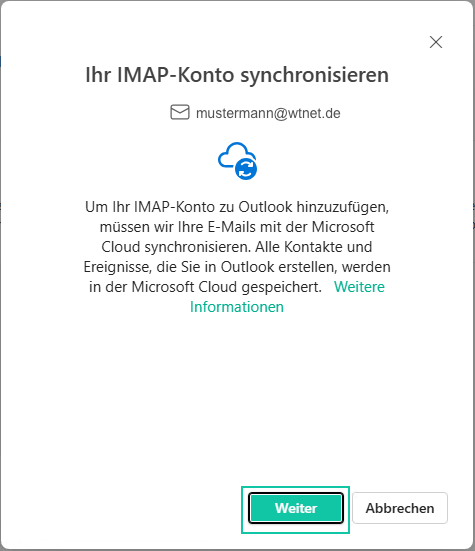 4. Geben Sie im Feld Vorgeschlagene Konten die gewünschte wilhelm.tel E-Mail-Adresse ein und klicken Sie auf Weiter.