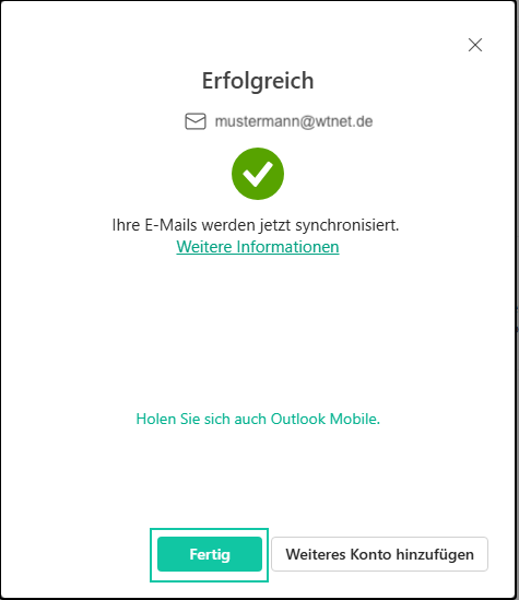 13. Nun klicken Sie auf Anmelden und Ihr Postfach ist eingerichtet. Jetzt noch auf Fertig klicken und Sie können Ihr Postfach benutzen.